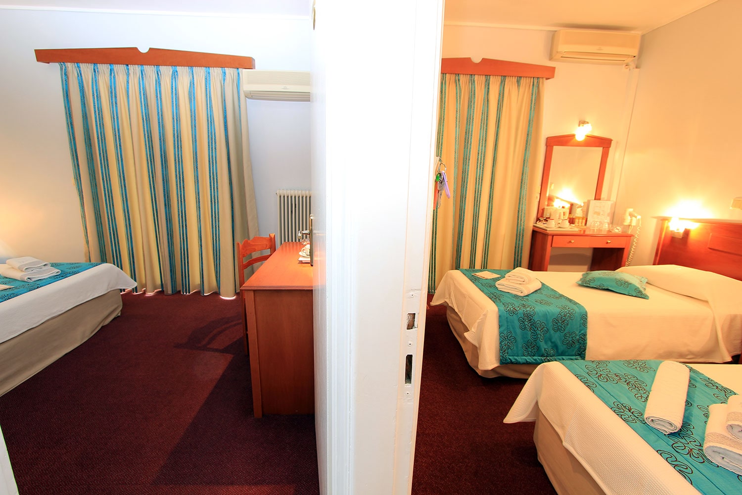 Δύο δίκλινα δωμάτια με κοινό μπάνιο , χωλ και εξωτερική πόρτα ιδανικά για οικογένειες προσφέροντας στον επισκέπτη μεγαλύτερη άνεση και πολυτέλεια σε προσιτή τιμή.